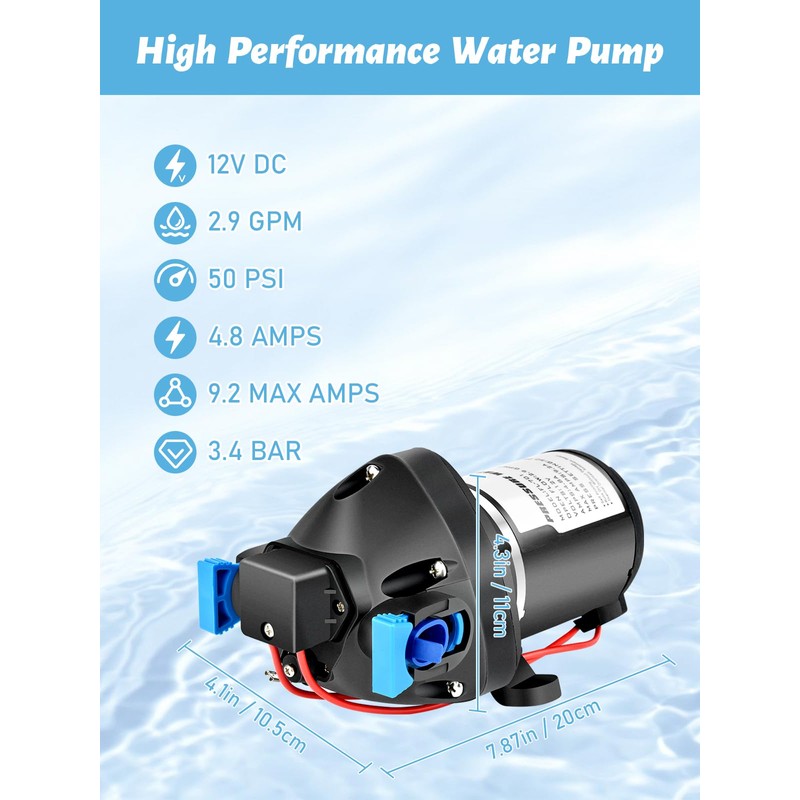 - 【12V Diaphragm Pump】This water pump is designed with a premium diaphragm that ensures reliable and efficient performance. With a voltage of 12V DC, it delivers a maximum flow rate of 2.9 GPM/11.0LPM, making it suitable for various applications such as RVs, campers, marine vessels, yachts, and caravans. The pump also features a built-in pressure switch for convenient control.