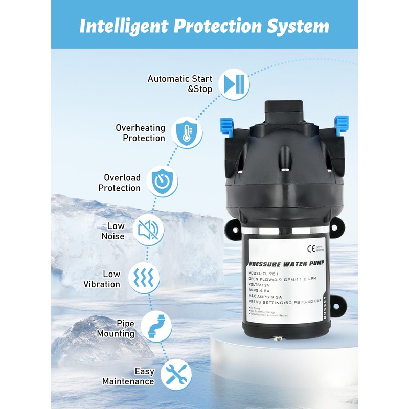 - 【Stable & Safety Protection】With minimal vibration and low noise levels, this water pump guarantees a stable and quiet operation. The 12V DC self-priming diaphragm pump has a built-in thermal protector and provides automatic pressure protection. Whether you're using it in an RV, camper, marine vessel, or yacht, this water pump will deliver exceptional performance and reliability.