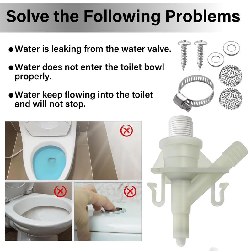 - [Package Includes]: 385311641 rv toilet valve replacement kit includes 1 x water valve, 1 x hose fasteners , 2 x screws and 2 x Stainless Mesh Filters.
