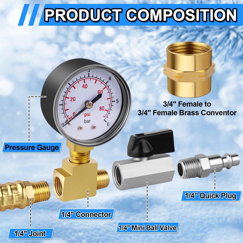 - 【Wide Application】The Boltigen upgraded boat winterizing kit with pressure guage is usually used for rv watercraft, garden hose, camper, boat and travel trailer,even sprinkler systems, garden hoses, and outdoor plumbing, etc.
