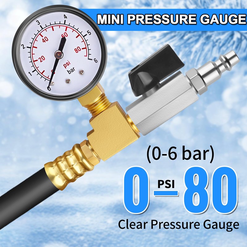 - 【Upgraded Camper Winterizing Kit】The Boltigen rv air compressor blowout adapter upgraded to with pressure guage and shut-off valve and 60inch extra long hose boat winterization hose kit. Easy to read pressure and control the use process.