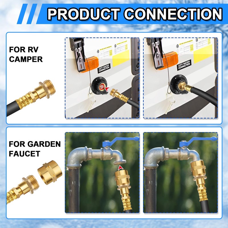 - 【Durable Material】The Boltigen camper winterizing kit (adapter and connector) is made of high quality brass with surface frosted parts of the highest quality, and the long winterizing hose is made of flexible reinforced synthetic rubber, waterproof and corrosion-resistant, the shut-off valve is made of durable Zinc Alloy. long time use without damage.
