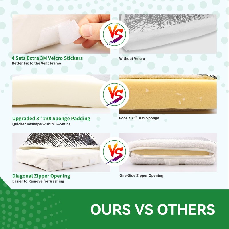 - Reshape within 3mins: Unlike other vent pillows filled with hard #35 sponge, our RV vent insulators are filled with 3” thick #38 premium upgrade sponge, which is more soft, enable the RV vent pillow to reshape within 3mins after take off the package