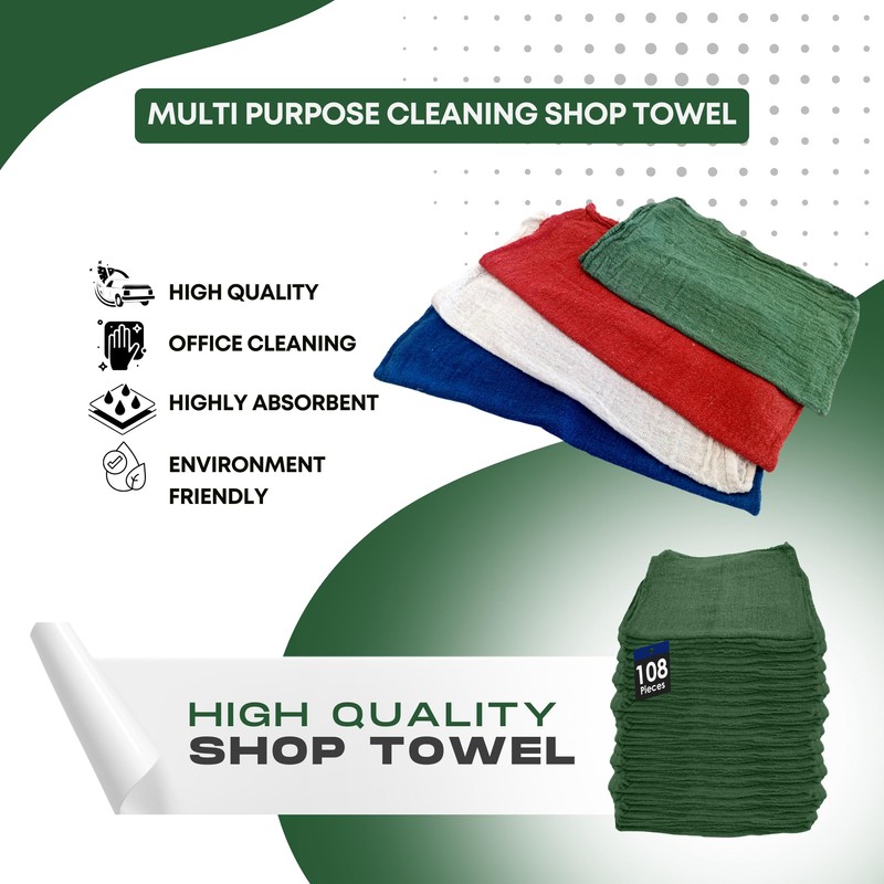 RW Rag Works Premium Ultra Absorbent Shop Towels | Lint Free and Dye Free Durable Cleaning Cloths for Workshops, Garages, Kitchens, and Household Use Cotton Rich Reusable Rags (Green - 108 Pack)
