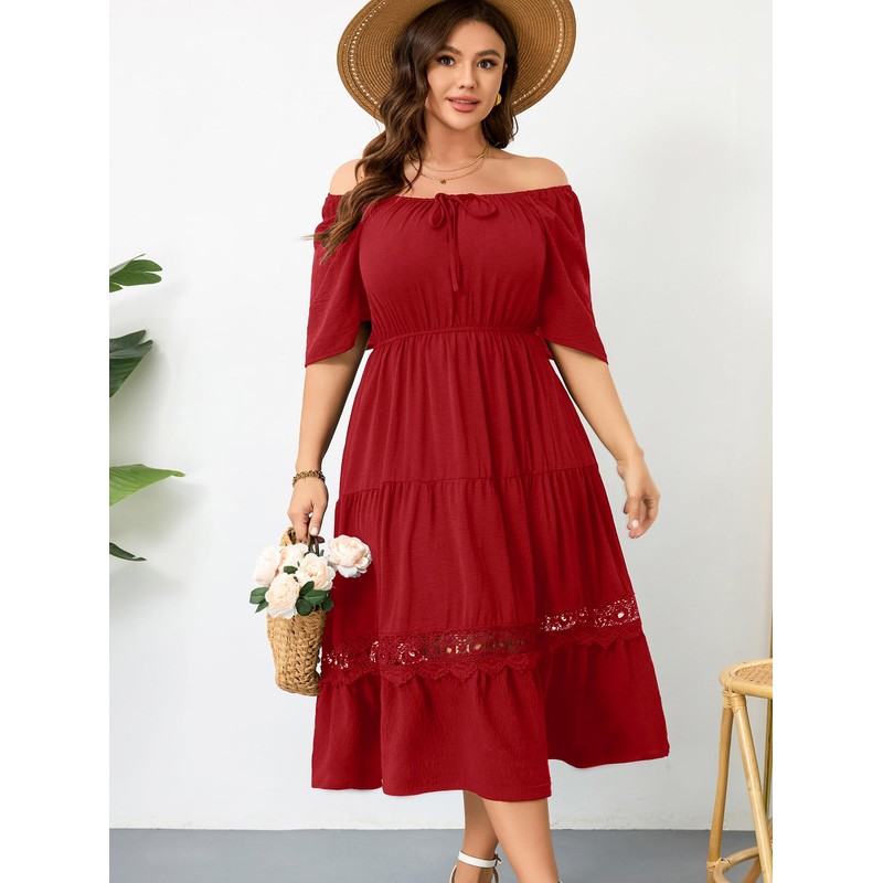 RWJ Maxi Dress, Summer Dresses Casual 2025 Plus Size Wedding Guest Dress Square Neck Ruffle A Line Boho Lace Off Shoulder Formal Cocktail Party Dresses for Women Red 3X-Large