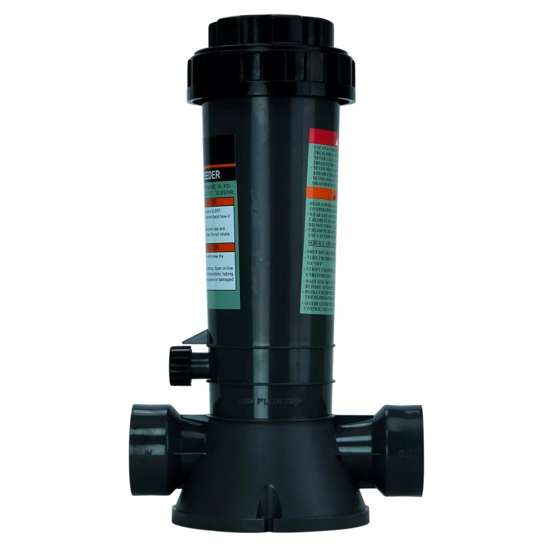 Our Rx Clear® Above Ground In-Line Automatic Chlorinator - assists in saving on chlorine usage and regulating the chlorine level. The dial adjustment valve helps to alleviate controls in sanitizer flow, and the body is corrosion-proof. It installs into the existing filter system without any hassle. The chemical feeder easily installs into your existing filter system with included installation hardware but requires additional PVC plumbing (not included). Save on chlorine use and regulate your chlorine level effortlessly. The dial adjustment valve controls sanitizer flow. Corrosion-proof. Installs easily into the existing filter system.