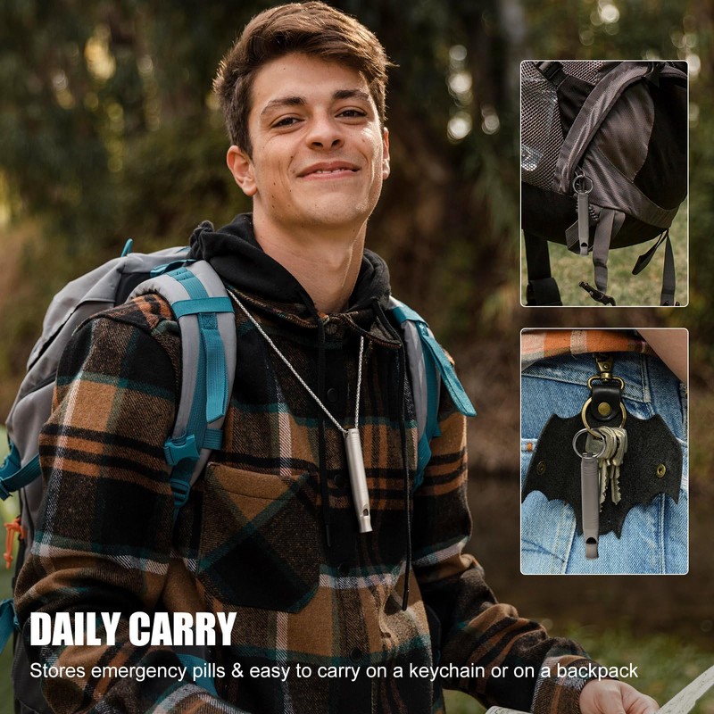 - 【Practical & Portable】This titanium alloy whistles combines a 100+ decibel sound with a hidden compartment for your crucial medications, ensuring both safety and convenience. It’s designed for effortless portability; at a mere 21.3g, whether clipped to your key chain or worn around your neck like a piece of jewelry, integrating seamlessly into your gear without adding bulk