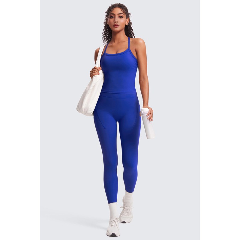 RXRXCOCO Cross Back Workout Sets for Women 2 Piece Padded Tank Tops Hidden Scrunch Leggings Gym Outfits with Pockets Blue Medium