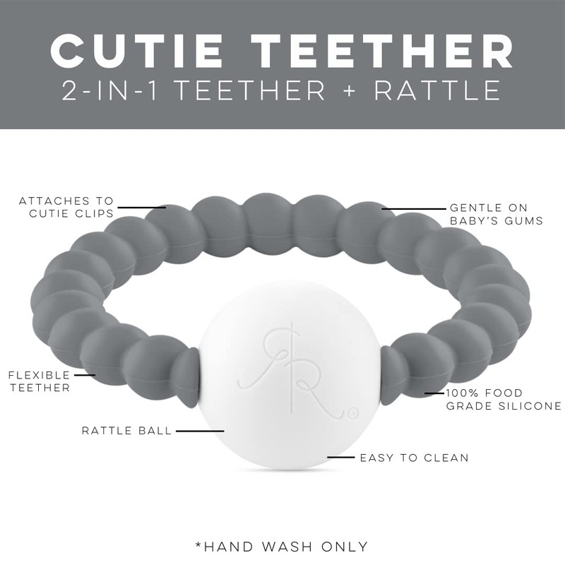 Our Cutie Teether is a 2-in-1 teether and rattle! If your little one is teething, then our Cutie Teether is just what they need! The Cutie Teether is made using 100% food grade silicone, it is safe, non-toxic, and free of BPA, PVC, phthalates, cadmium, and latex. The Cutie Teether is compliant. Made in China. Cutie Teethers also match and attach to Cutie Clips. Directions: Clean Cutie Teether with soap and water and let air-dry. Do NOT wash in a dish washer and/or sterilizer. Disclaimer: Do not use without full supervision. Inspect before every use and discard if damaged. Do not tie around child's neck and never allow a child to use while sleeping.