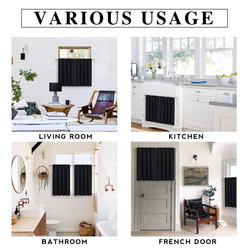 RYB HOME Black Curtains for Windows, Bathroom Curtains Small Window Drapery Blackout Curtains Privacy Drapes for Cafe Bedroom Curtains, Width 29 by Length 24, 1 Pair