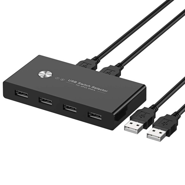 - 【One Button Switch】allows one button swapping between 2 computers to share 4 USB 2.0 peripheral devices without constantly swapping cables or set up complicated network sharing software.