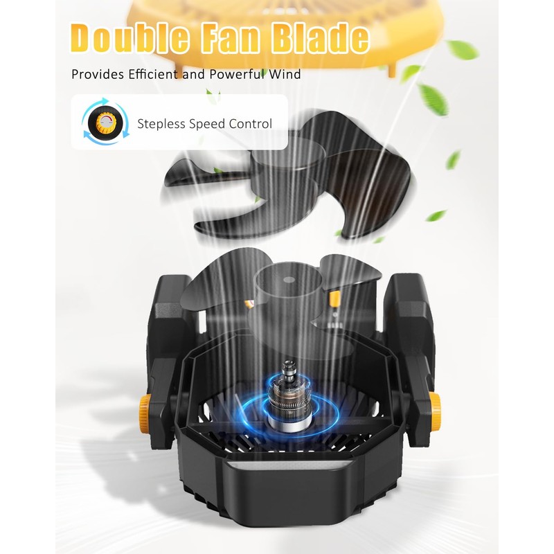 - [Adjustable 270° & Dual Motor Drive]: With a 270° rotation capability, this fan ensures you can easily adjust its direction upwards or downwards, covering a wide range of angles. Equipped with powerful dual motors and double-layered blades, the camping fan can drive more air faster, achieving a blowing distance of up to 12 feet. The stepless speed adjustment allows for precise control over airflow intensity, enabling you to customize your cooling experience for enhanced comfort.