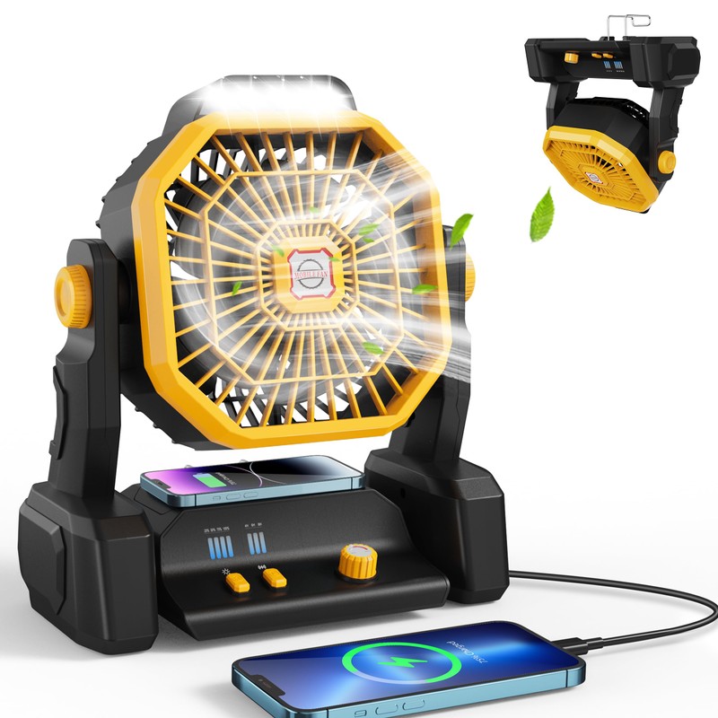 - [15W Wireless Charging]: This portable camping fan is equipped with a 15W fast wireless charging pad at its base, allowing you to enjoy a cool breeze outdoors while effortlessly charging your smartphone or other wireless charging-compatible devices. In addition, this battery-operated fan supports USB-A output, enabling wired charging for your phone through a charging cable. With two charging outputs, it ensures you stay connected and powered up even when you're outdoors.