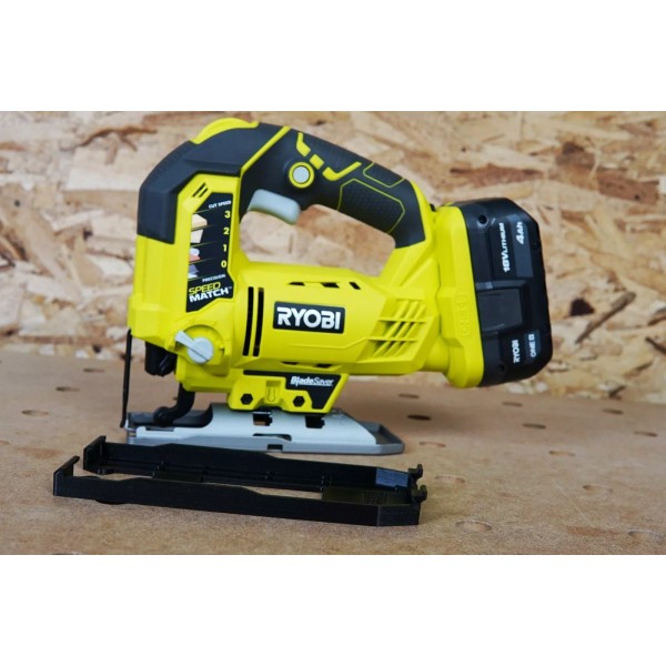 ToolCurve sole base plate for the Ryobi 18v Jig Saw. The Ryobi jig saw doesn't come standard with a sole plate, allowing the metal base to scratch up and damage your work peices when in use. This snap on plate helps protect your jig saw and your base plate when in use.