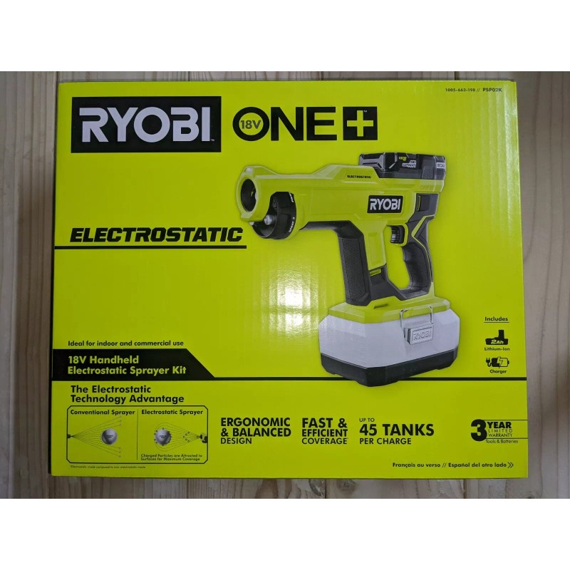 The RYOBI 18V ONE+ Cordless Handheld Electrostatic Sprayer Kit allows you to spray disinfectants, cleaning solutions, and deodorizers with cordless convenience. RYOBI Electrostatic Sprayers utilize electrostatic charging technology to positively charge particles to allow solutions to cover surfaces quicker and more evenly, reducing chemical use and increasing efficiency. These charged particles enable solutions to more effectively wrap around a wide range of high touch surfaces. This handheld electrostatic sprayer features an ergonomic design to reduce user fatigue and increase portability. Spray up to 45 tanks per charge with an 18V ONE+ 2.0 Ah battery. This sprayer reaches up to 5 ft. and has an on/off switch to activate the electrostatic technology. The tool-free 3-in-1 adjustable turret allows you to easily change between 50, 75, and 100 microns for a variety of spray patterns, cleaning applications, and chemical dwell time requirements. The tool-free removable nozzles allow users to easily clean and replace nozzles. The removable 1-liter tank has a flat base for hands-free, easy filling. This sprayer is compatible with additional tank sizes for added versatility. Best of all, it is part of the RYOBI ONE+ System of over 260 cordless tools that all work on the same battery platform. Backed by the RYOBI 3-Year Manufacturer's Warranty, the 18V ONE+ Cordless Handheld Electrostatic Sprayer Kit includes a 2.0 Ah Battery, an 18V Charger, and an operator's manuals.
