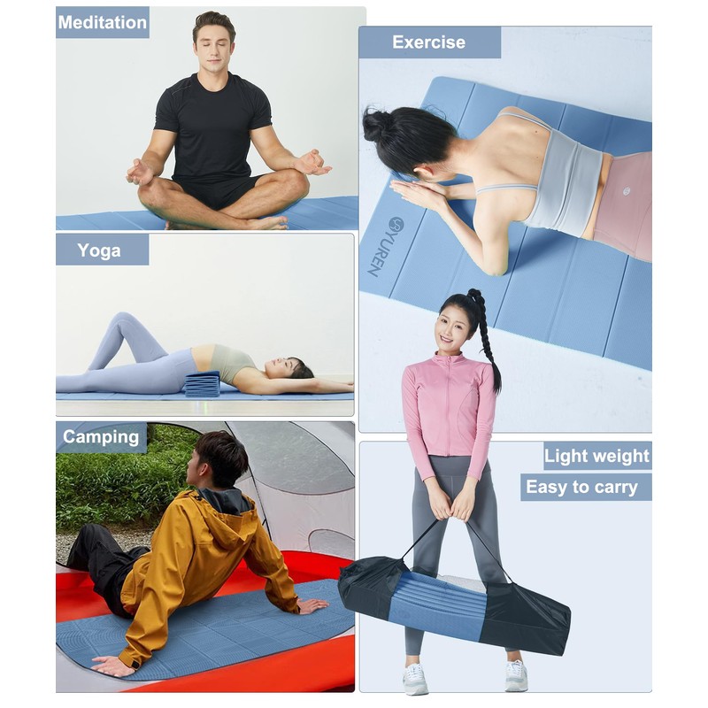 - Foldable Yoga Mat: Travel yoga mat folds up easily and opens to be completely flat without curling up. Mat can be folded small and square (35.4x6.3x5.5 inch) and weighs only 3.75lbs