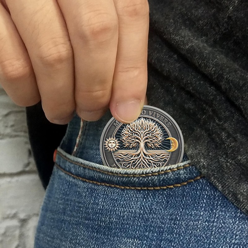 - Embracing Life’s Duality and Purpose :The reverse side features the Life Tree, symbolizing the endless growth and continuity of life. Its intertwined roots and branches emphasize the interconnection of all living things. Flanked by the Sun and Moon, the tree represents life’s duality—light and dark, day and night. The inscriptions “Memento Vivere” (Remember to Live) and “Fac Vitam Incredibilem” (Make Life Incredible) encourage us to live fully, pursue our dreams, and cherish every moment