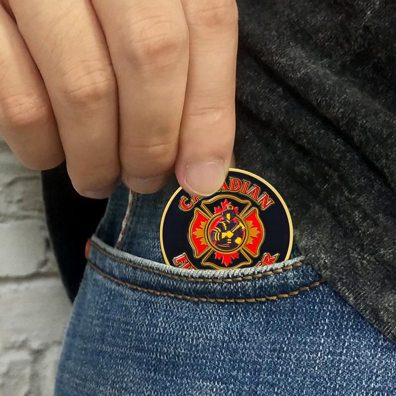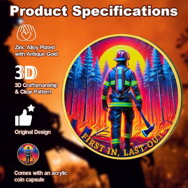 Introducing the Firefighter Challenge Coin, a powerful tribute to the courage, sacrifice, and dedication of firefighters. The front design of the fireman challenge coin highlights a firefighter in full gear, holding an axe, with massive wings behind him, embodying strength and resilience. The text "FIRST IN, LAST OUT" symbolizes the firefighter's commitment to always being the first to enter danger and the last to leave. Flames and a forest setting emphasize the extreme conditions firefighters face daily. The reverse side of the fire department coin features the classic Canadian firefighter cross with an image of a firefighter holding an axe in the center. Surrounding the symbol are the words "CANADIAN FIREFIGHTER," showcasing national pride and honoring the brave men and women who serve Canada. The bold red, gold, and black colors symbolize strength, sacrifice, and honor. Made from high-quality zinc alloy and plated with antique gold, this firefighter hero coin measures 1.57 inches in diameter and 0.12 inches in thickness, making it the ideal size for both display and wear. Each coin comes with an acrylic capsule, making it convenient for daily carrying as a reminder of the strength and service of firefighters. This firefighter coin makes a meaningful gift for firefighters, fire department professionals, or anyone who admires the heroism of first responders. Whether for retirement, graduation, or as a token of appreciation, it serves as a lasting tribute to their courage, sacrifice, and unwavering commitment to keeping communities safe.