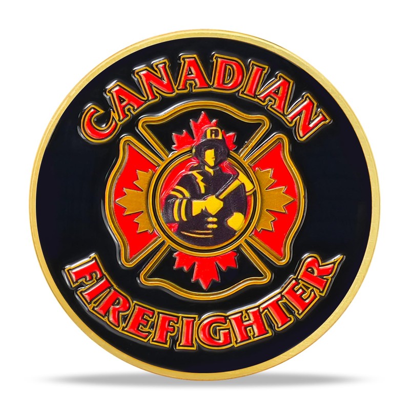 • Canadian Pride & Firefighter Heritage:The reverse side of the fireman challenge coin features the classic Canadian firefighter cross, with an image of a firefighter holding an axe in the center. The words “CANADIAN FIREFIGHTER” surround the symbol, showcasing national pride and honoring the brave men and women who serve Canada. The bold use of red, gold, and black creates a powerful contrast, symbolizing strength, sacrifice, and honor