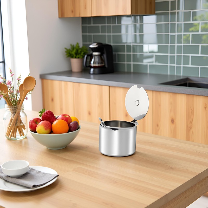 • CAPACITY: 285ml stainless steel sugar bowl with matching spoon, perfect for serving sugar, condiments, or seasonings