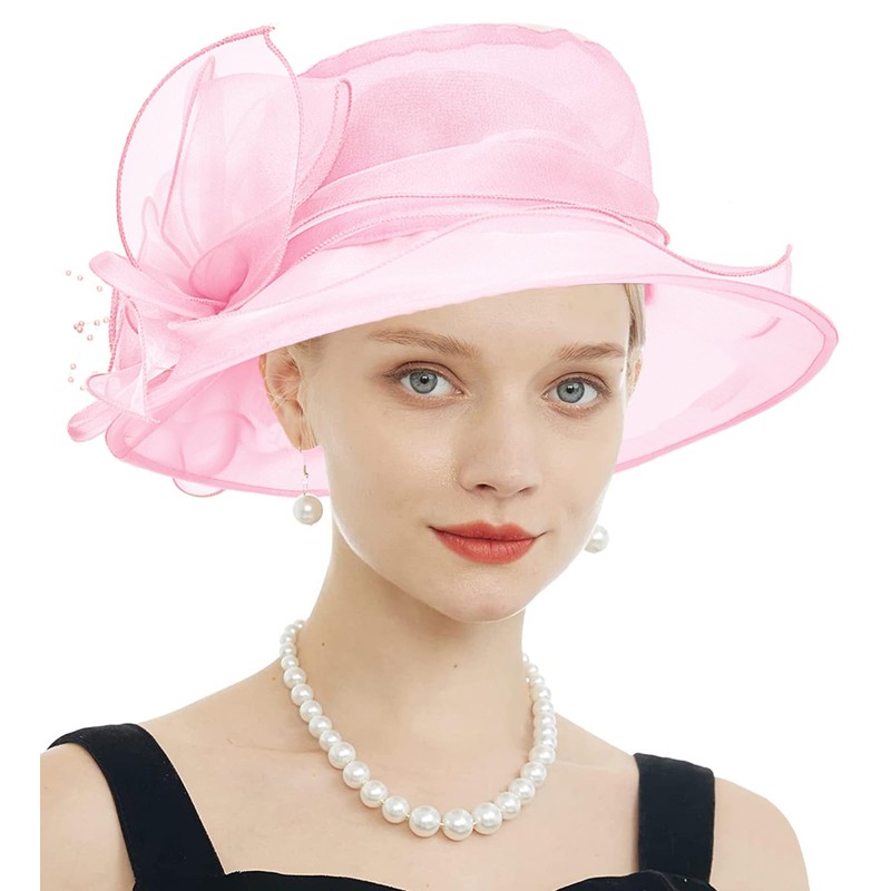RZTA Women's Kentucky Derby Church Dress Hat Wide Brim Leaf Flower Bridal Shower Hat, F8 Pink, One Size
