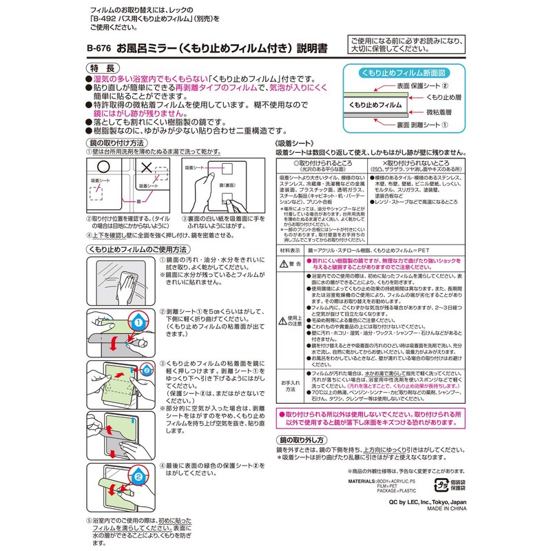 | Material Type: | Mirror = Acrylic, Styrofoam resin, Anti-fog film = PET, Suction sheet = Polyurethane resin |