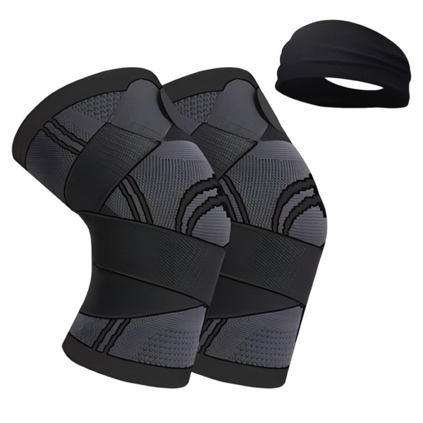膝サポーター 2枚セット + ヘアバンド スポーツ用 怪我防止 通気性伸縮性 ランニング 男女左右兼用 黒 調整可能 加圧ベルトスポーツ用 滑り止め 通気性 保温性 (S(2枚)+ヘアバンド)