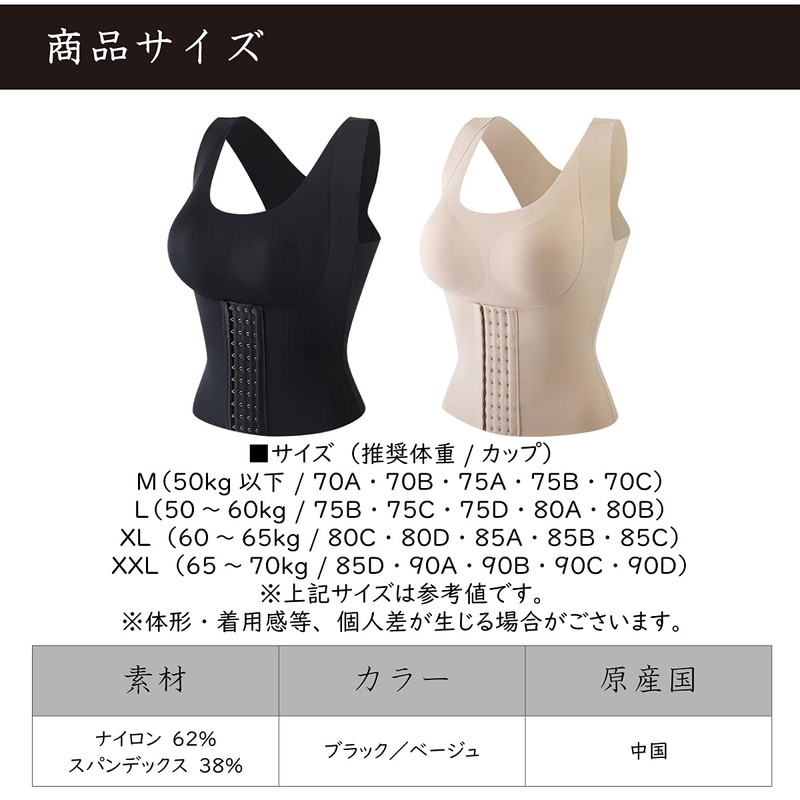 - ■Material Nylon 62% Spandex 38% ■Size (Recommended Weight/Cup) M (110.2 lbs (50 kg) / 70B / 75A / 75B / 75B / 75C / 75D / 80A / 80B / XL (60 - 65 kg) / 80C / 80D / 85A / 85A B・85C) XXL (143.3 - 154.3 lbs (65 - 70 kg); 85D, 90A, 90B, 90C, 90D) *Size is for reference only. There may be slight differences in the shape of the body and fit, etc. ■Color: Black/Beige; Country of Origin: China *Due to the nature of the product's material, color may fade and transfer to other clothing, so please wash separately from other laundry to avoid wearing light colored outer clothing