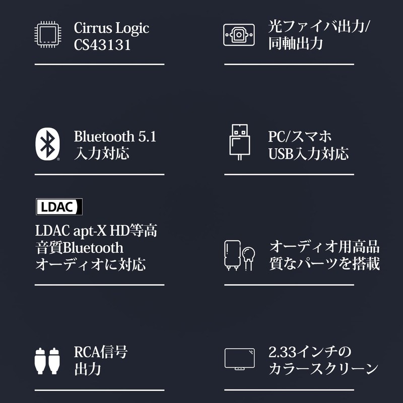- Equipped with Cirrus Logic's high-performance DAC chip "CS43131", it achieves excellent audio performance with 0.002% ultra-low distortion, and 128dB SNR
