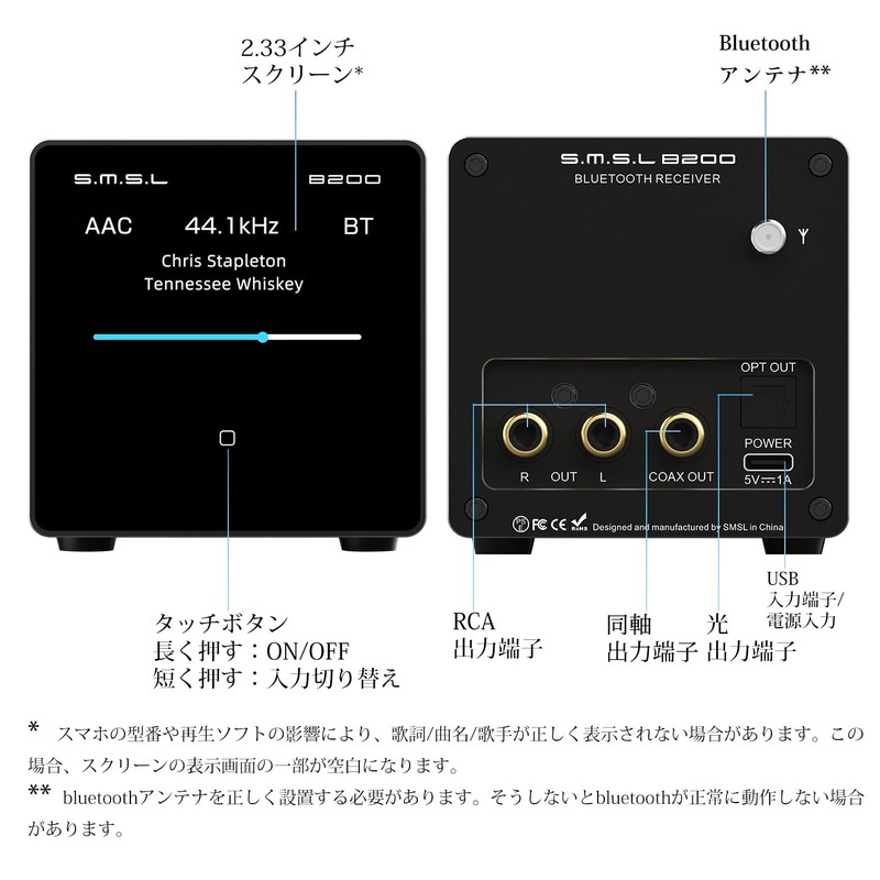 - With a wide range of compatible devices, the B200 supports Bluetooth input and USB input, and comes with three output terminals of light, coaxial, and RCA. The B200 allows you to easily configure your own HiFi audio system by using Bluetooth/USB input to audio DAC, power-amplifier, and active speaker