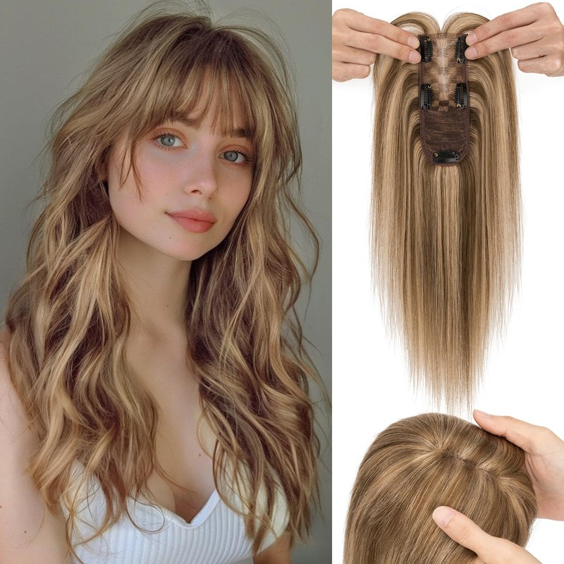 - Natural Human Hair Topper with Bangs: The hair topper for women comes with 4.5-5.5 inch air bangs that add a youthful and stylish touch.Made from 100% real human hair, it is soft, smooth, and can be heat-styled to match your desired look—whether straight, wavy, or curly.Ideal for weddings, date nights, or daily wear