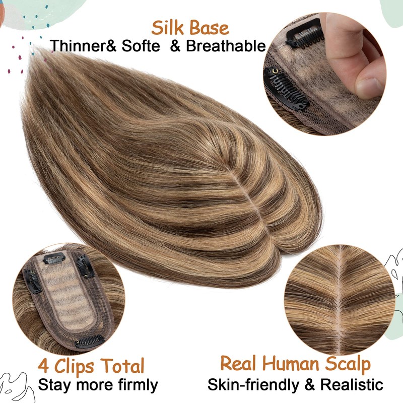 - About Silk Base:Compare with other topper, Silk Base Hair Topper is the most natural and real top hairpiece for it is consist of three-layered material (silk base/ lace/inner base). Machine-made net base overlaps hand-made silk base to create a natural effect;