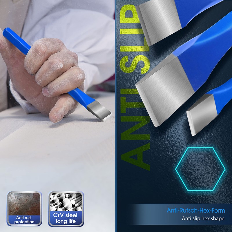 - Forged and tempered chisels made of chromium vanadium steel. Hardness 52-58 HRC