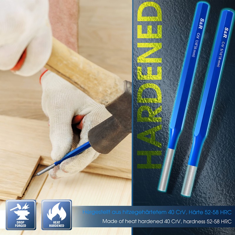 S&R pin Punch Set 6 pcs. Made of Chrome Vanadium Steel, Hardened 1,5mm / 3mm / 4mm / 5mm / 6mm / 8mm || 1/16 ', 1/8', 5/32 ', 3/16', 1/4 ', 5/16' pin Punch Set