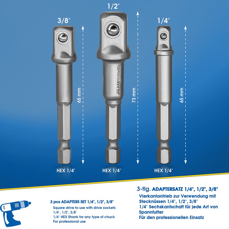- Length of the socket adaptor: 1/4 inch - 65 mm; 3/8 inch - 65 mm; 1/2 inch - 73 mm.