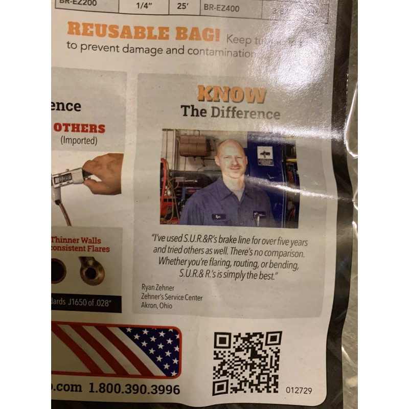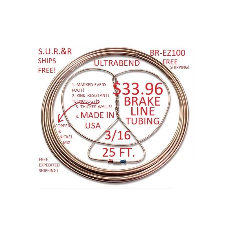 This brake tubing is pressure-rated up to 3,000 psi and meet SAE specifications. You can replace multiple brake lines using metric and standard fittings with this low-cost, labor-saving tubing. Installing your brake tubing can be a breeze. S.U.R.&R. E-Z bend tubing can be easily bent by hand, making routing jobs simpler. Special Copper/Nikel formula greatly reduces the likelihood of a kink! Brand: