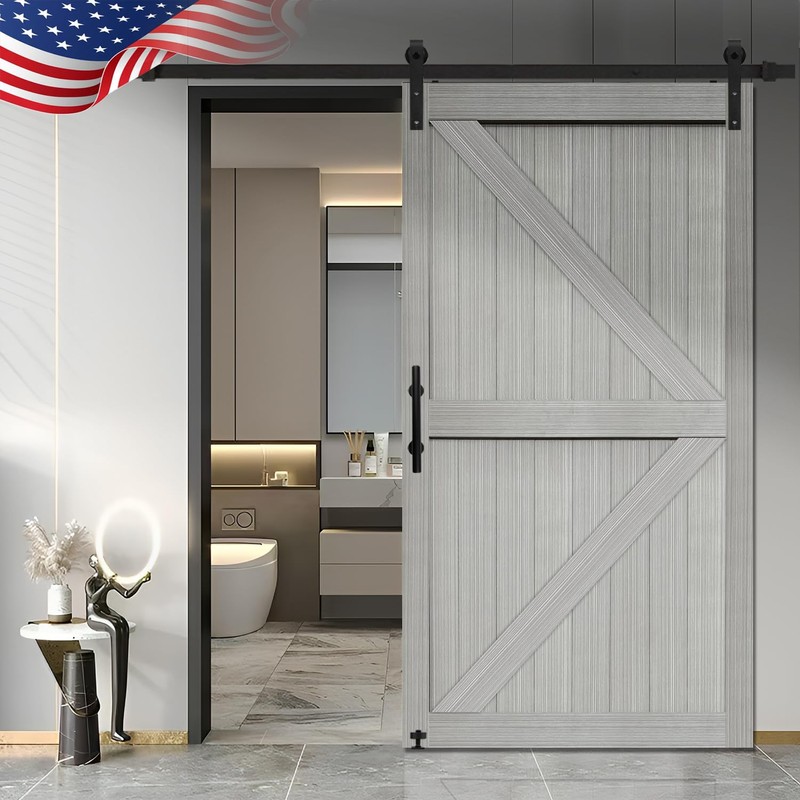 S&Z TOPHAND® 42in x 84in MDF Light Gray Barn Door with 8FT Sliding Door Hardware Kit, Solid Barn Door Slab Covered with Water-Proof PVC Surface/Simple Assembly is Required