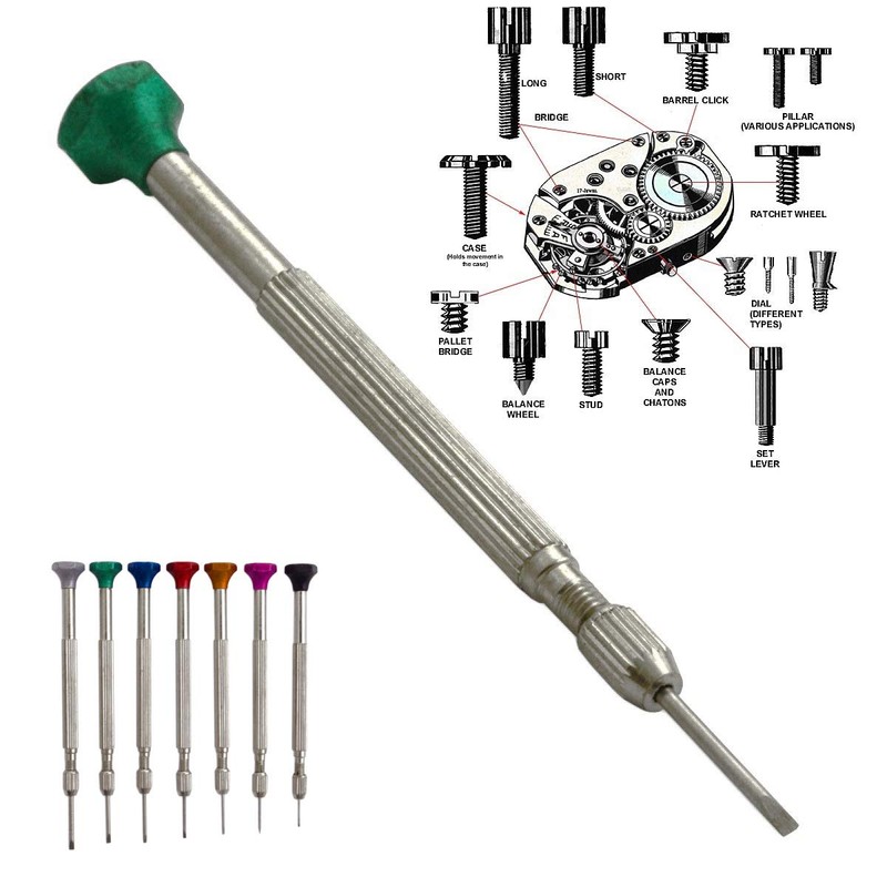 • The watchmaker's screwdrivers are colour-coded and have the following blade widths: 0.6 - 0.7 - 0.8 - 1.0 - 1.2 - 1.4 and 1.6 mm.