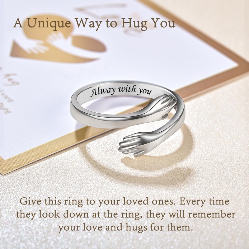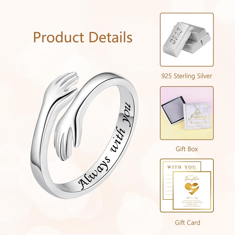 - Design: A hug is a symbol of comfort, encouragement, love and protection. The silver ring engraved "Always with you" means wherever you are I will be always with you like this hug ring hugging you forever