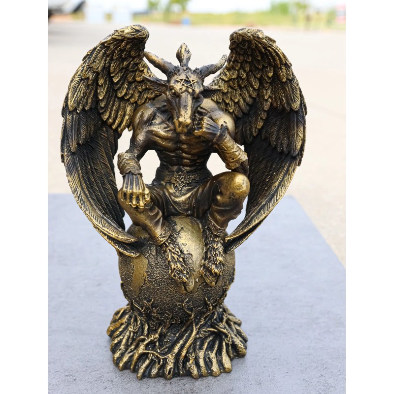 • This rendering of Baphomet is not the original created by Eliphaz Levi (we sell that on a different listing) but Baphomet is comingled with Rodin's famous work The Thinker (Le Penseur) statue which is a contemplating man. Baphomet here is sculpted as a man with wings and a goat head, sitting on the globe with vines of snares as the base. The sculpting is immaculate and the details of the Baphomet will astound all eyes that see him.