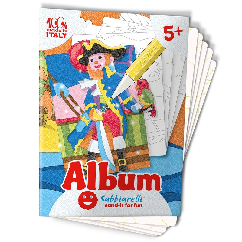 - Product: album Sabbiarelli with 5 different drawings of the world of pirates, to paint with sand. 100% Made in Italy