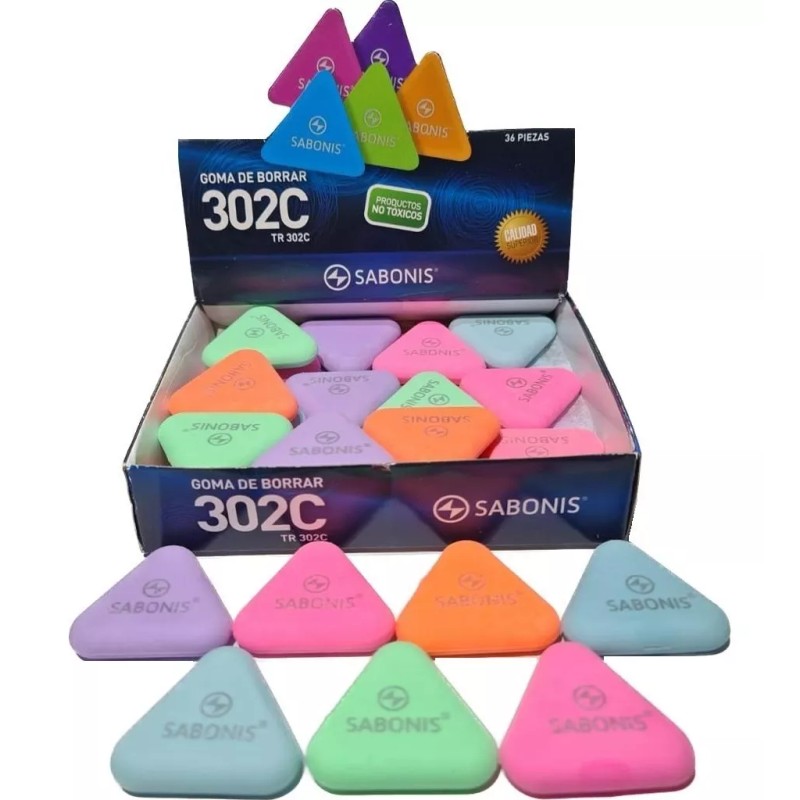 La Goma Triangular Sabonis TR302 es un producto de alta calidad de la reconocida marca Sabonis. Este paquete incluye 36 piezas de gomas de borrar en una caja, presentadas en cinco colores surtidos, lo que las hace atractivas y divertidas para los usuarios. A pesar de su colorido diseño, estas gomas no son de borrar lápiz de color, sino que están diseñadas para borrar lápiz de grafito de manera eficiente, sin manchar ni dejar residuos.