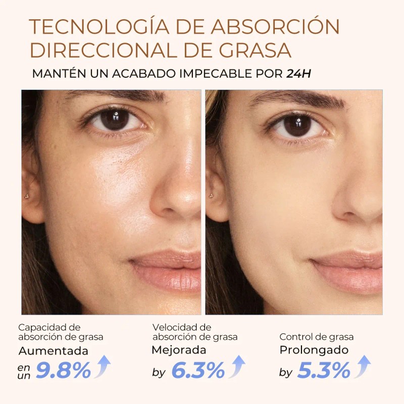 - Retouches en Movimiento: Diseño compacto cabe en bolsos. Toca en zona T o mejillas para absorber grasa y renovar el look al instante.