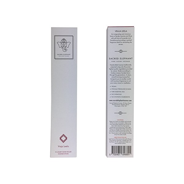 Vraja Leela Luxury Indian Incense Sticks -Light, stimulating and very floral. A complex and sophisticated blend of Jasmine and Rose with soft hints of Lavender and Sandalwood. This makes for an invigorating and exciting aromatic experience – sure to lift spirits, stimulate creativity and bring a fragrant flower garden atmosphere indoors.