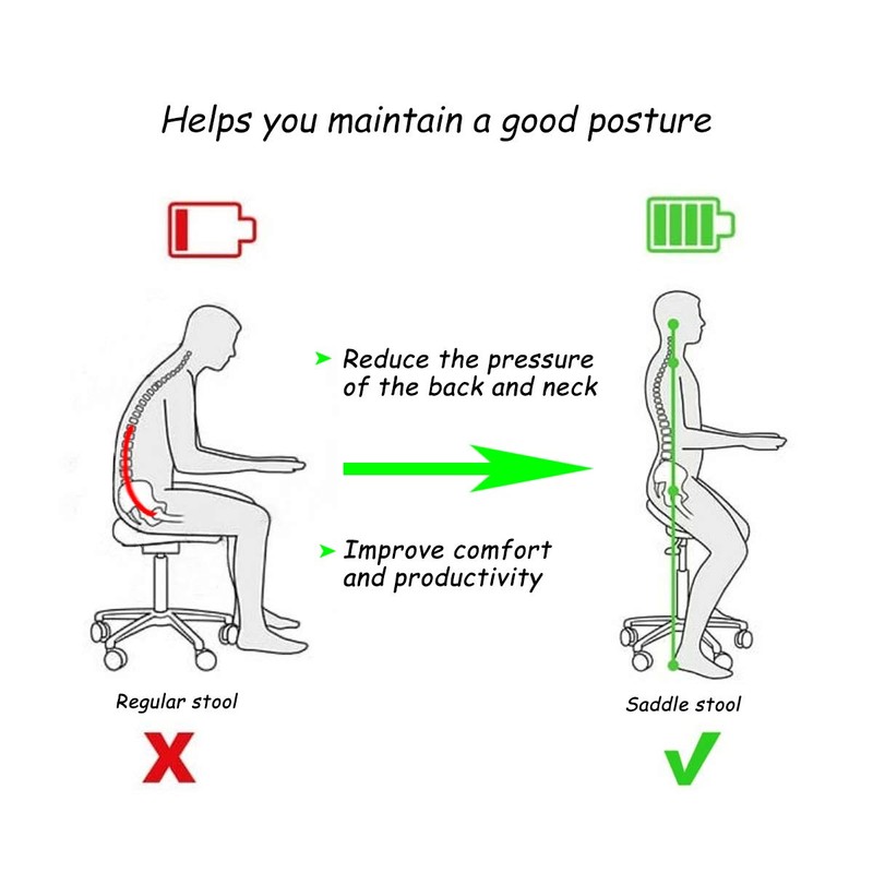 Saddle seat design for extra comfort on your back and spine, increase comfort and productivity.