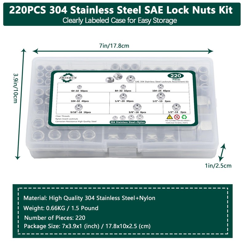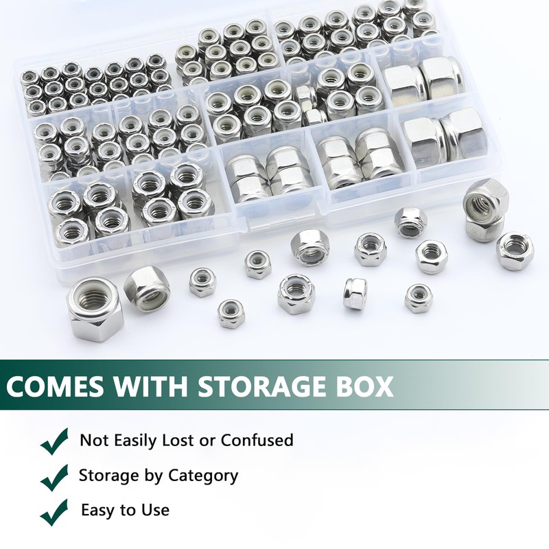 - Includes Storage Box: Comes with a clear storage box to keep 8 different sizes of imperial nylock nuts sorted in the box for easy storage and use, and they are not easy to lose or confuse during use.