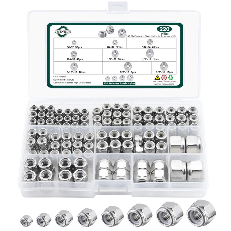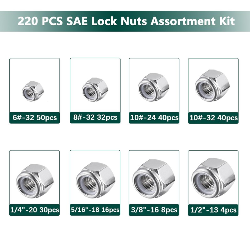 - SAE Lock Nuts Size:SAE lock nuts assortment kit are available in sizes: 6#32(50 pcs), 8#32(32 pcs), 10#24(40 pcs), 10#32(40 pcs), 1/4"-20(30 pcs), 5/16"-18(16 pcs), 3/8"-16(8 pcs), 1/2"-13(4 pcs), 8 different sizes of locknuts to meet your needs in different scenarios.