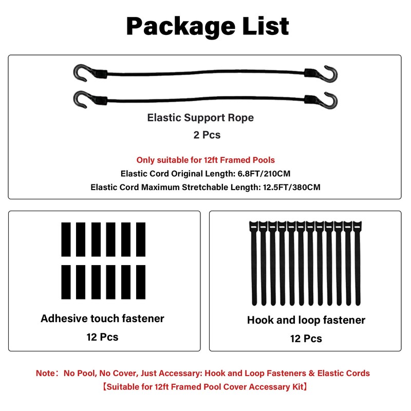 - Package List: 12 sets of Hook and Loop Fastener Kits; 2 pcs Elastic Support Rope. NOTE: No cover, No Pool, Just the Accessory. 【Please confirm whether your pool cover and swimming pool meet the following Applicable Conditions before order. If you are not sure, please ask our professional customer service.】Perfectly fit our SAFANA 12FT Pool Covers and other pool covers that meet the applicable conditions.