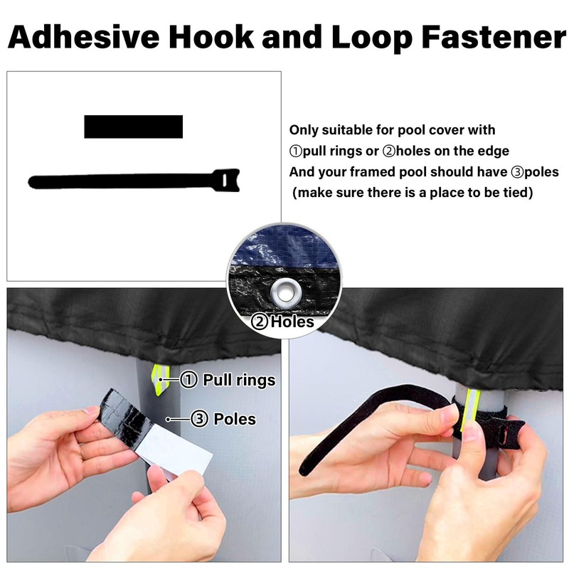 - Applicable Conditions ①: Hook and Loop Fastener Kits → Only suitable for pool cover with pull rings or holes on cover's edge. Make sure there is a place on the cover where Hook and Loop Fastener can be passed through and hung. And your framed pool should have poles (make sure there is a place to be tied)