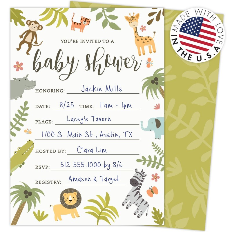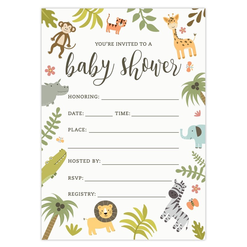 Safari Baby Shower Invitations Set of 25 Fill-In Style Cards and Envelopes. Jungle theme with Monkey Giraffe Elephant Lion and Zebra. Printed on Heavy Card Stock.